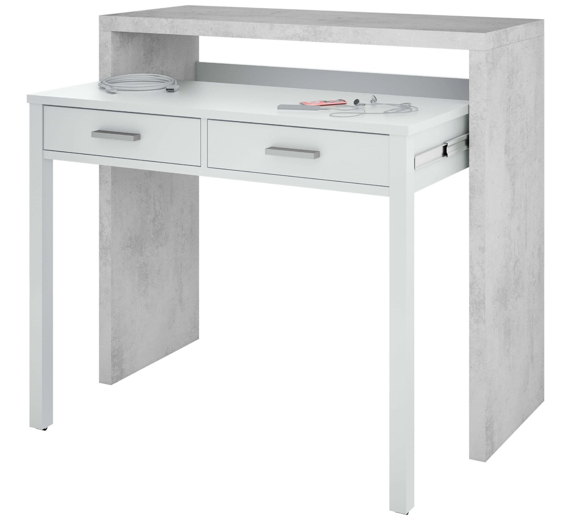 Introducing the Turin Arctic White and Concrete Grey Extending Desk/Dressing Table or Console Table, a versatile and stylish addition to any home. This adaptable table features an extension mechanism that provides additional surface area when needed, making it perfect for use as a desk, dressing table, or console table. Its clean and modern aesthetic, highlighted by sleek lines and a chic combination of white and concrete grey finishes, ensures it complements any decor. Ideal for maximising space and enhancing your living environment with contemporary elegance and functionality.