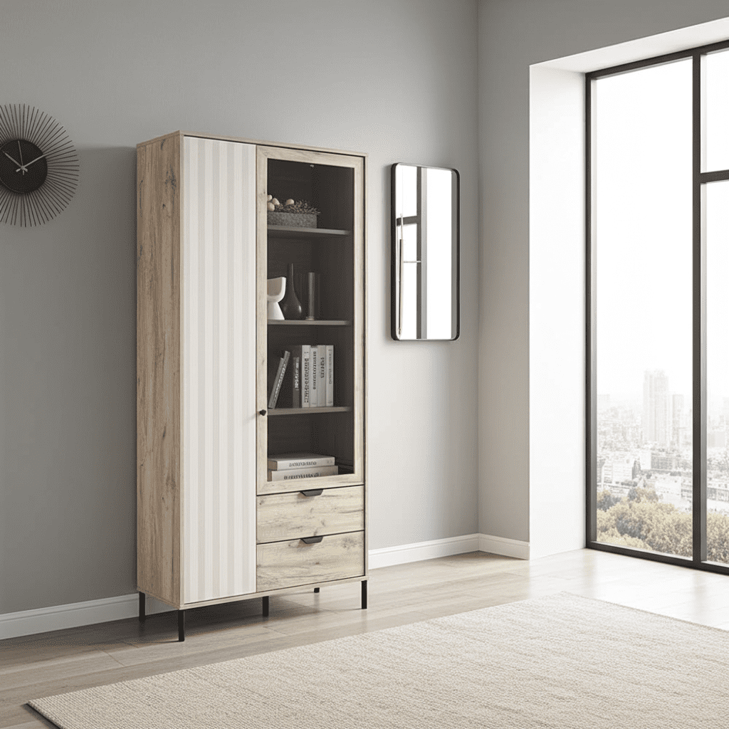 The Vivea Grey Oak Effect & Cashmere Slatted 2 Door Display Cabinet combines modern elegance with practical storage, featuring a sleek grey oak finish and stylish slatted doors. Perfect for showcasing décor while keeping essentials neatly tucked away.